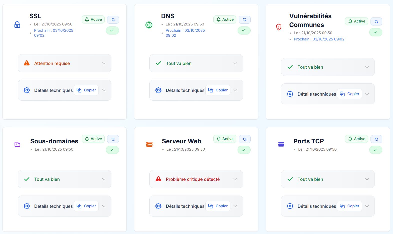 Les rapports produits sont visuels, catégorisés et orientés action. Vous n’avez pas besoin d’être expert en cybersécurité pour comprendre l’état réel de vos sites web.