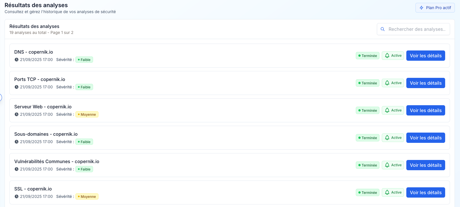Copernik permet de planifier des scans automatiques (quotidiens, hebdomadaires, mensuels) et d’être alerté en temps réel lorsqu’une nouvelle faille est détectée.